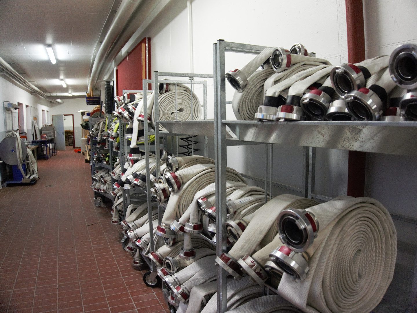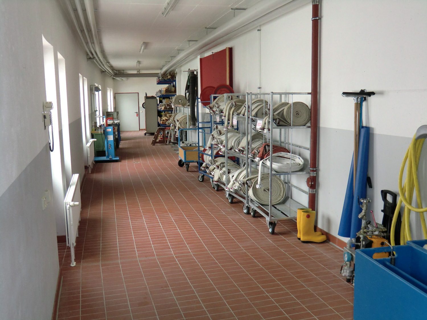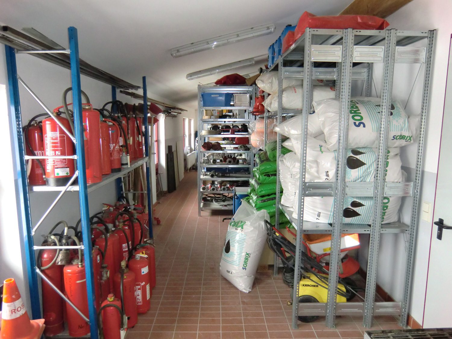Hinter der Fahrzeughalle befindet sich das Lager, in dem Übungsfeuerlöscher, Ölbinder, Nebelmaschinen, Übungspuppen usw. stehen