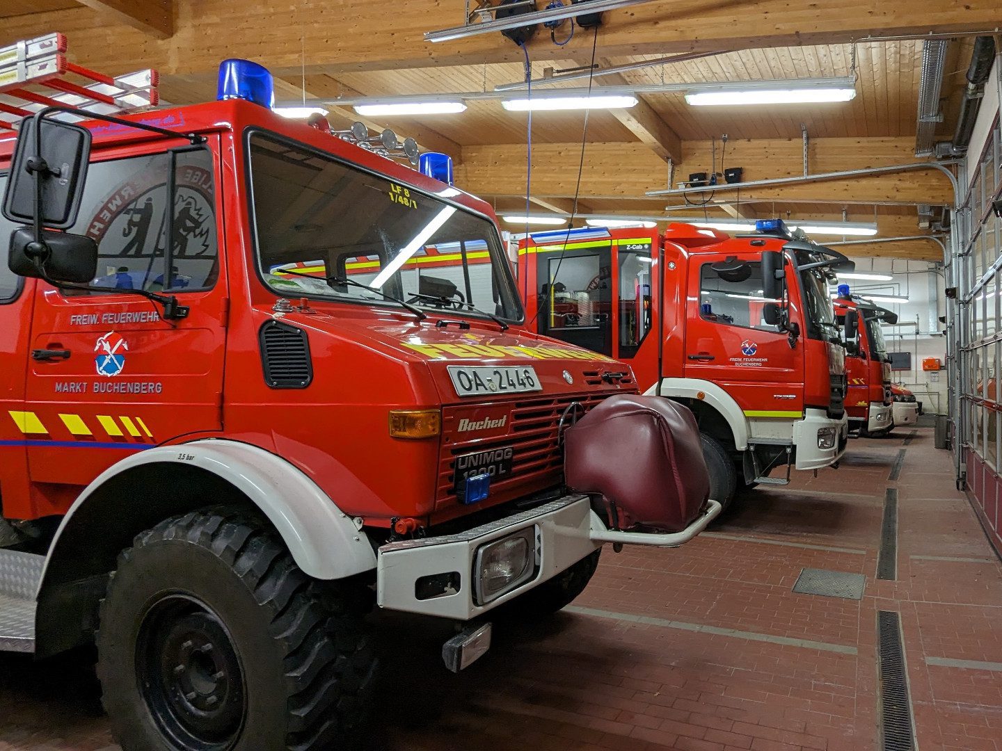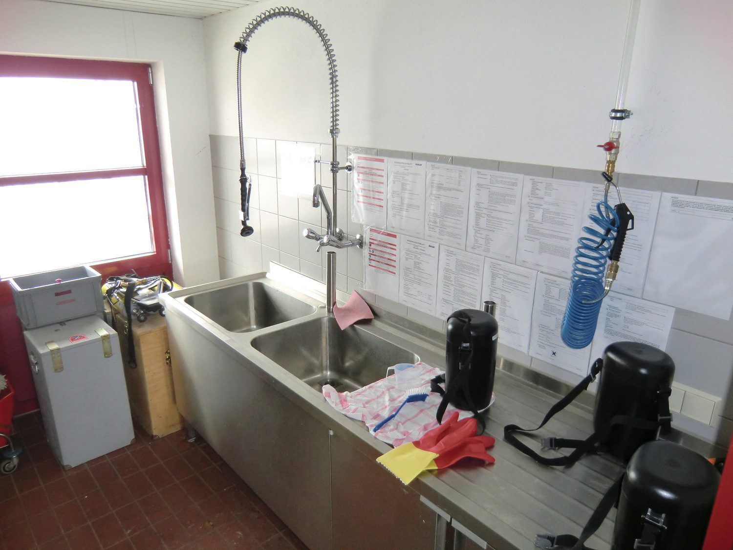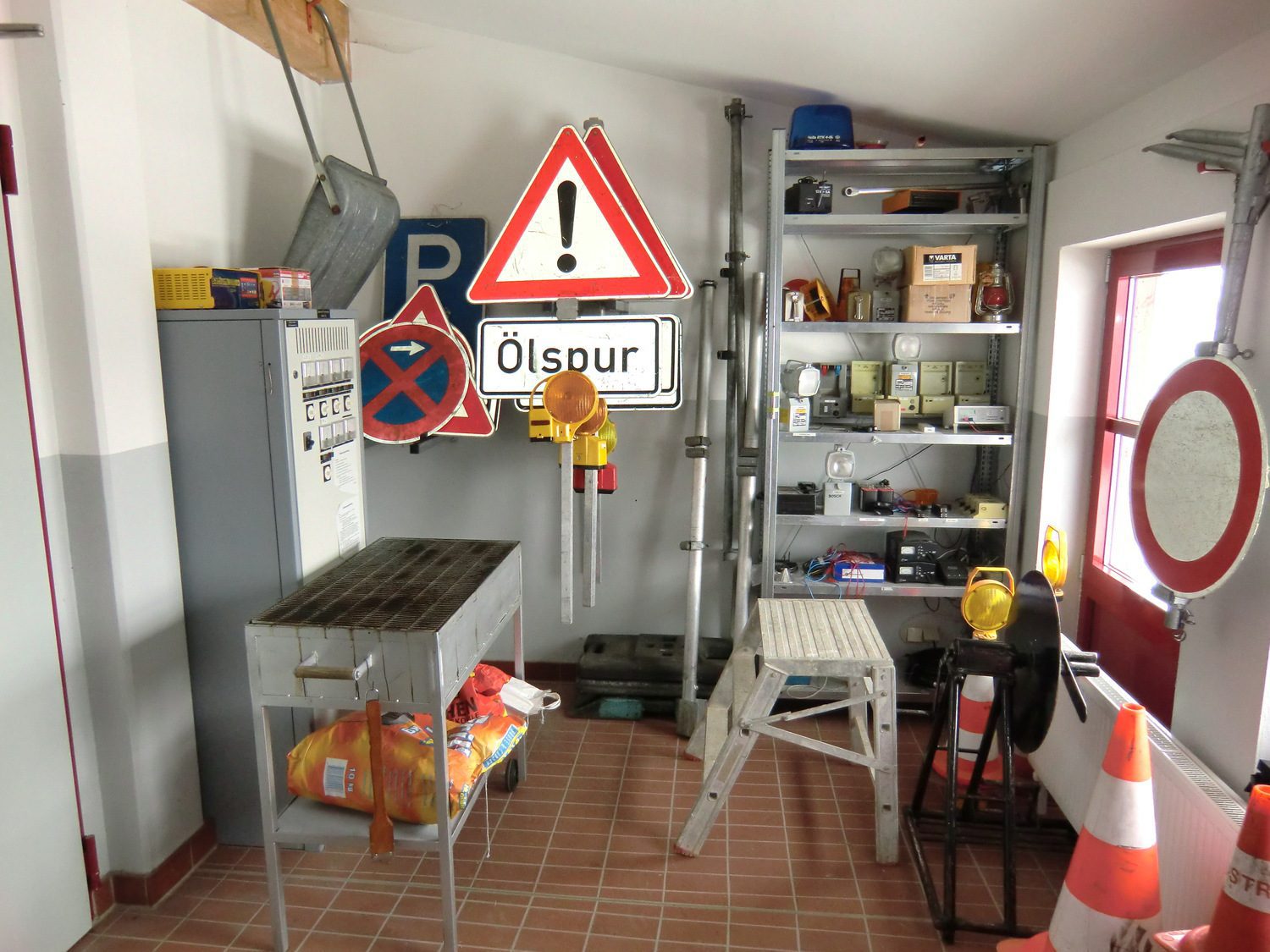 Hinter der Fahrzeughalle befindet sich das Lager, in dem Übungsfeuerlöscher, Ölbinder, Nebelmaschinen, Übungspuppen usw. stehen