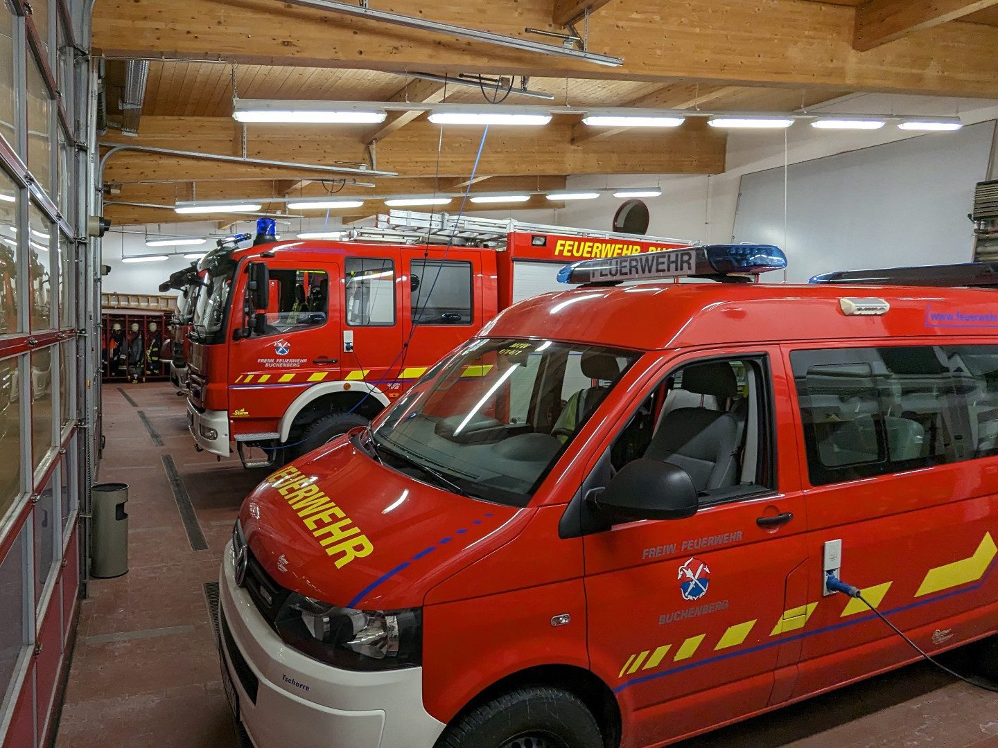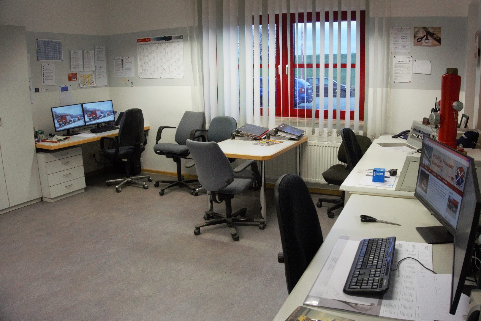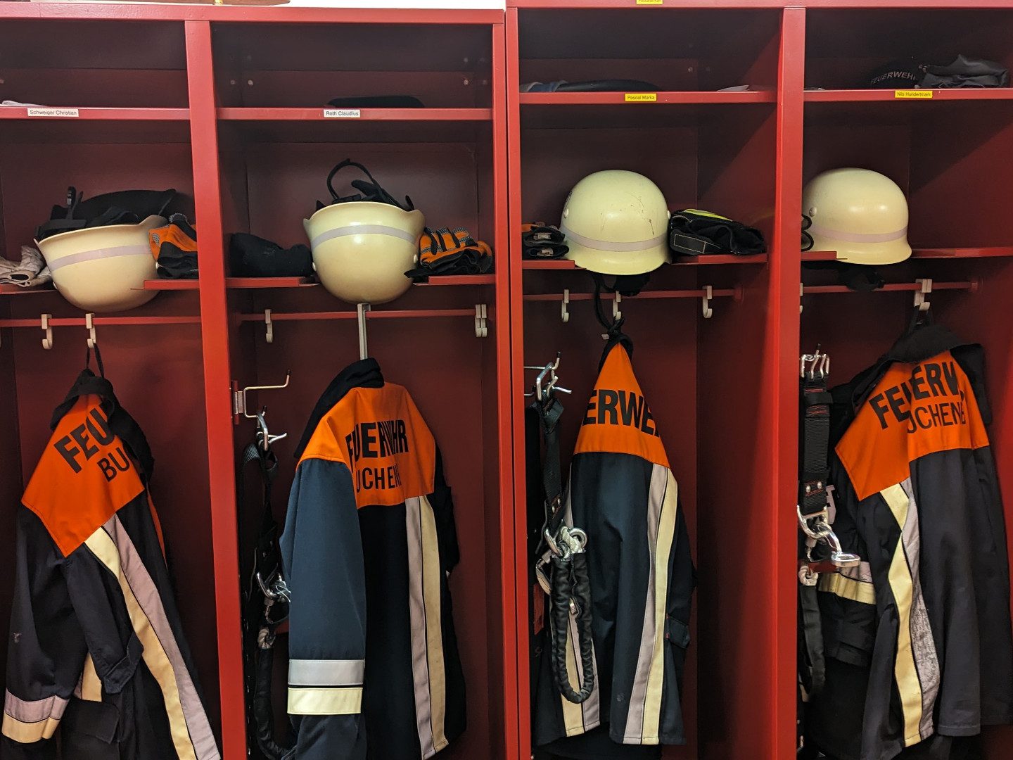 Die große Fahrzeughalle beherbergt vier Stellplätze und 45 Spinde. Der Alarmbildschirm ist mit unserem Alarmsystem gekoppelt. Hier erhalten die EInsatzkräfte per Durchsage und Kurzinfo alle Informationen. Die gleichen Informationen werden auch auf die Tablets in den Fahrzeugen gesendet.