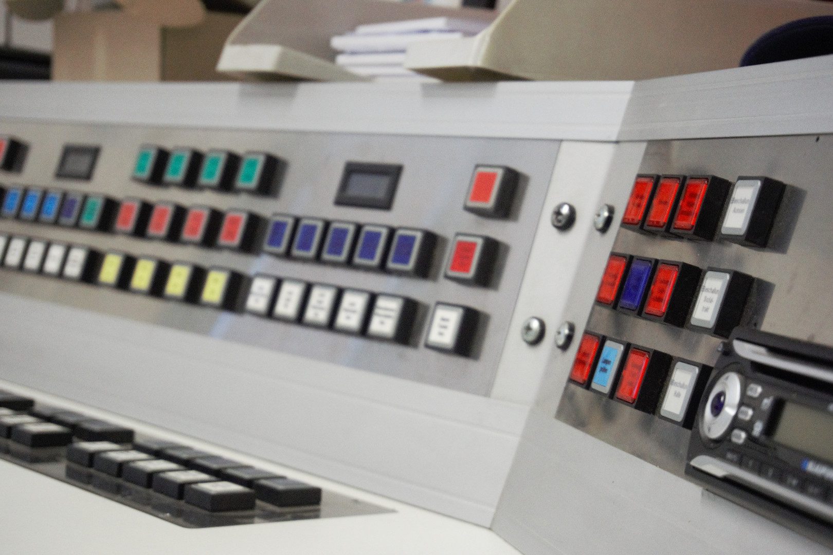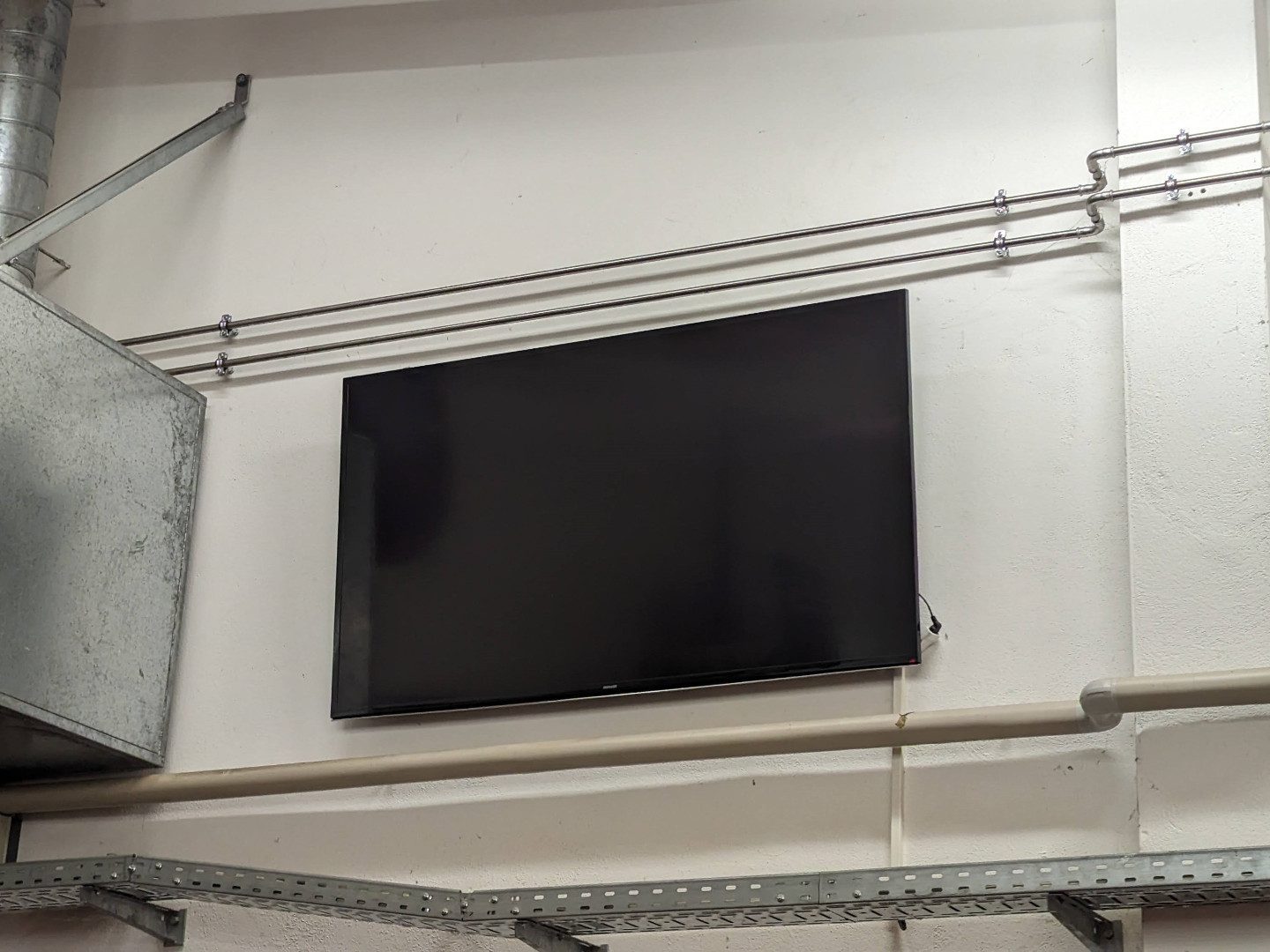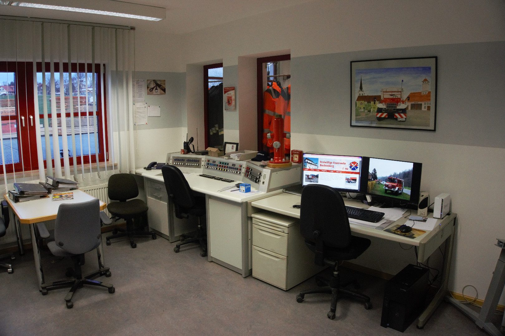 Die große Fahrzeughalle beherbergt vier Stellplätze und 45 Spinde. Der Alarmbildschirm ist mit unserem Alarmsystem gekoppelt. Hier erhalten die EInsatzkräfte per Durchsage und Kurzinfo alle Informationen. Die gleichen Informationen werden auch auf die Tablets in den Fahrzeugen gesendet.
